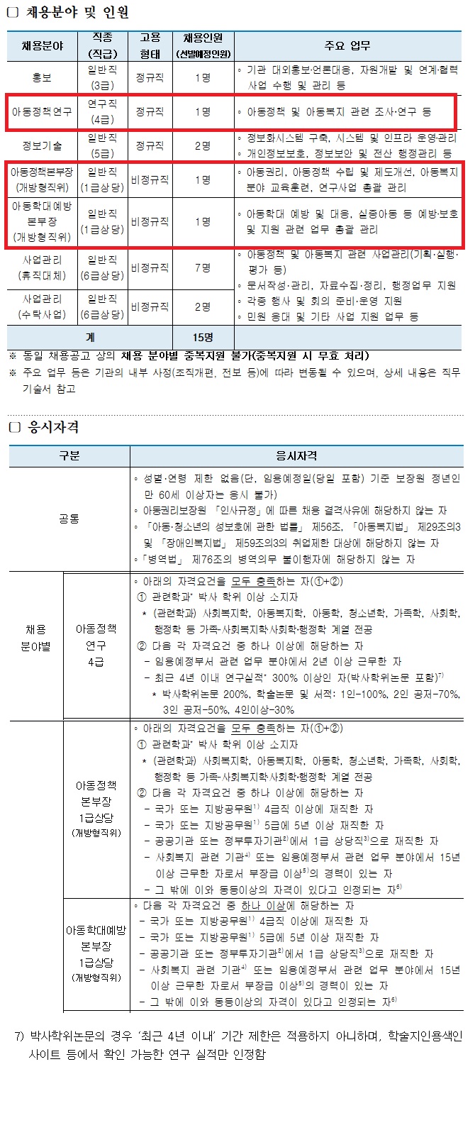 아동권리보장원에서 연구직 4급(부연구위원), 개방형직위(아동정책본부장 및 아동학대예방본부장)을 채용 중에 있습니다.