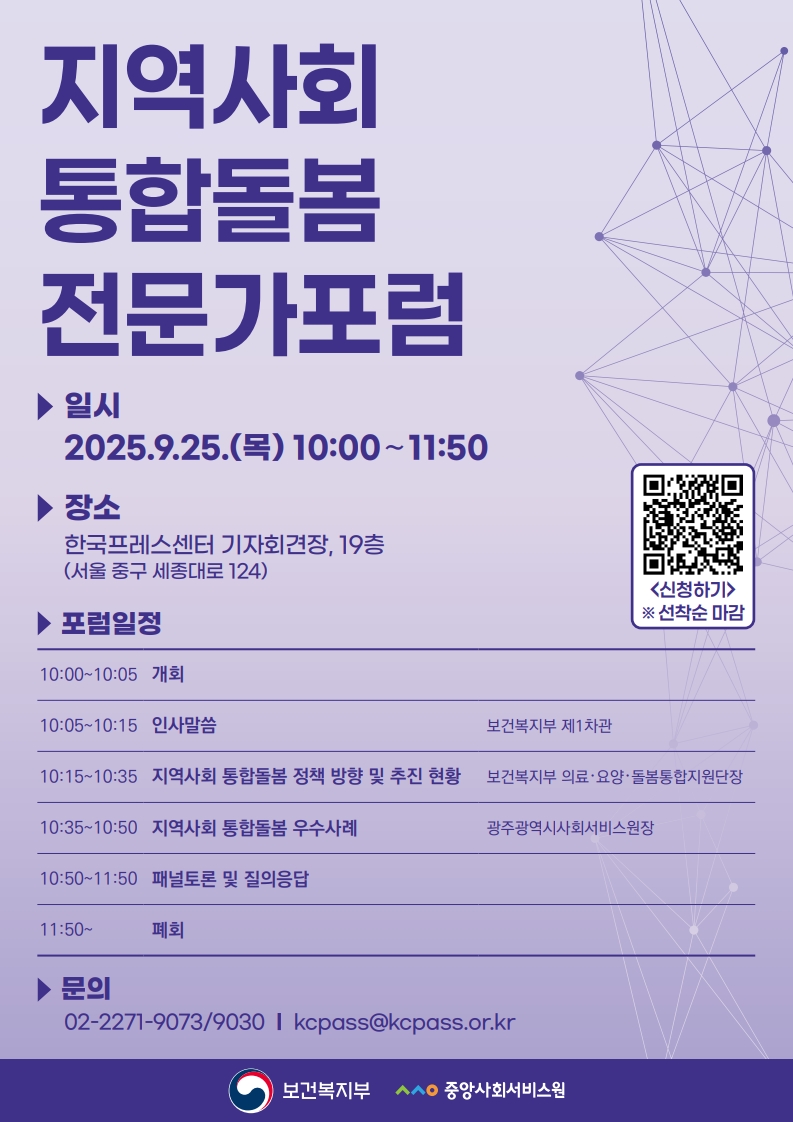 ◈ 일시: 2025. 9. 25.(목) 10:00 ~ 11:50 ◈ 장소: 한국프레스센터 기자회견장, 19층 (서울 중구 세종대로 124) ◈ 주최·주관: 보건복지부(주최) / 중앙사회서비스원(주관) ◈ 현장 참여 신청하기 (선착순 마감)