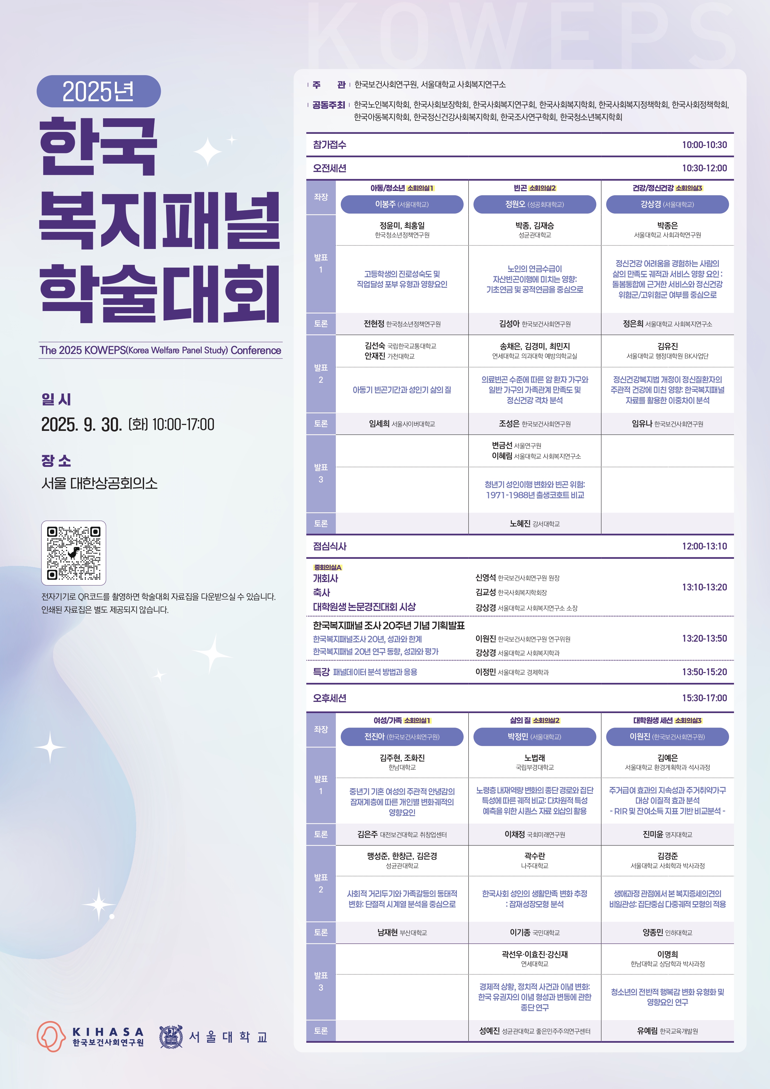 다가오는 9월 한국복지패널 학술대회의 최종 포스터 및 초청장을 공유드립니다.