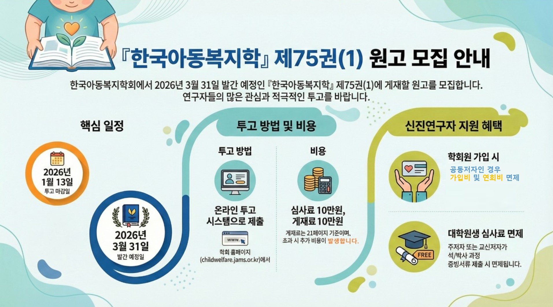 한국아동복지학회는 2026년 3월 31일 발간예정인 『한국아동복지학』 제75권(1)의 원고를 모집하고 있습니다.