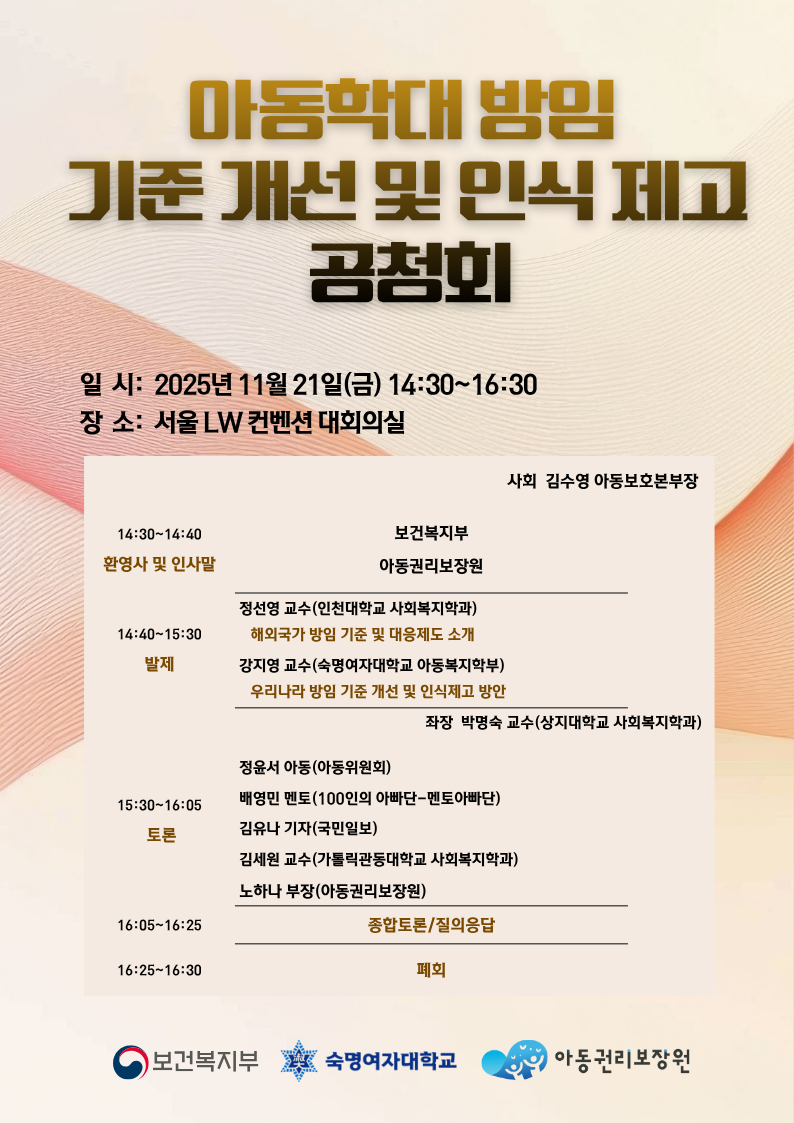 서울 LW컨벤션 대회의실에서 11월 21일 14시30분 아동학대 방임 기준 개선 및 인식 제고 공청회를 개최합니다.