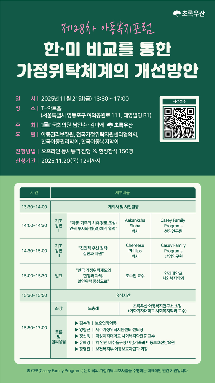1. 주 제: 한·미 비교를 통한 가정위탁체계의 개선방안 2. 일 시: 2025.11.21.(금) 13:30~17:00 3. 장 소: T-아트홀(서울특별시 영등포구 여의공원로 111, 태영빌딩 B1) 4. 접수기간: 2025.11.20(목) 12시까지 5. 기 타: 사전접수 페이지 통한 참가신청, 참가비 없음 6. 문 의: 초록우산 어린이재단 아동복지연구소(02-775-9122/내선 0131, 0133, 0134) |