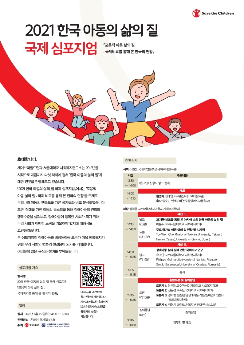 '포용적 아동 삶의 질 : 국제비교를 통해 본 한국의 현황'이라는 주제를 가지고 웨비나로 개최됩니다.