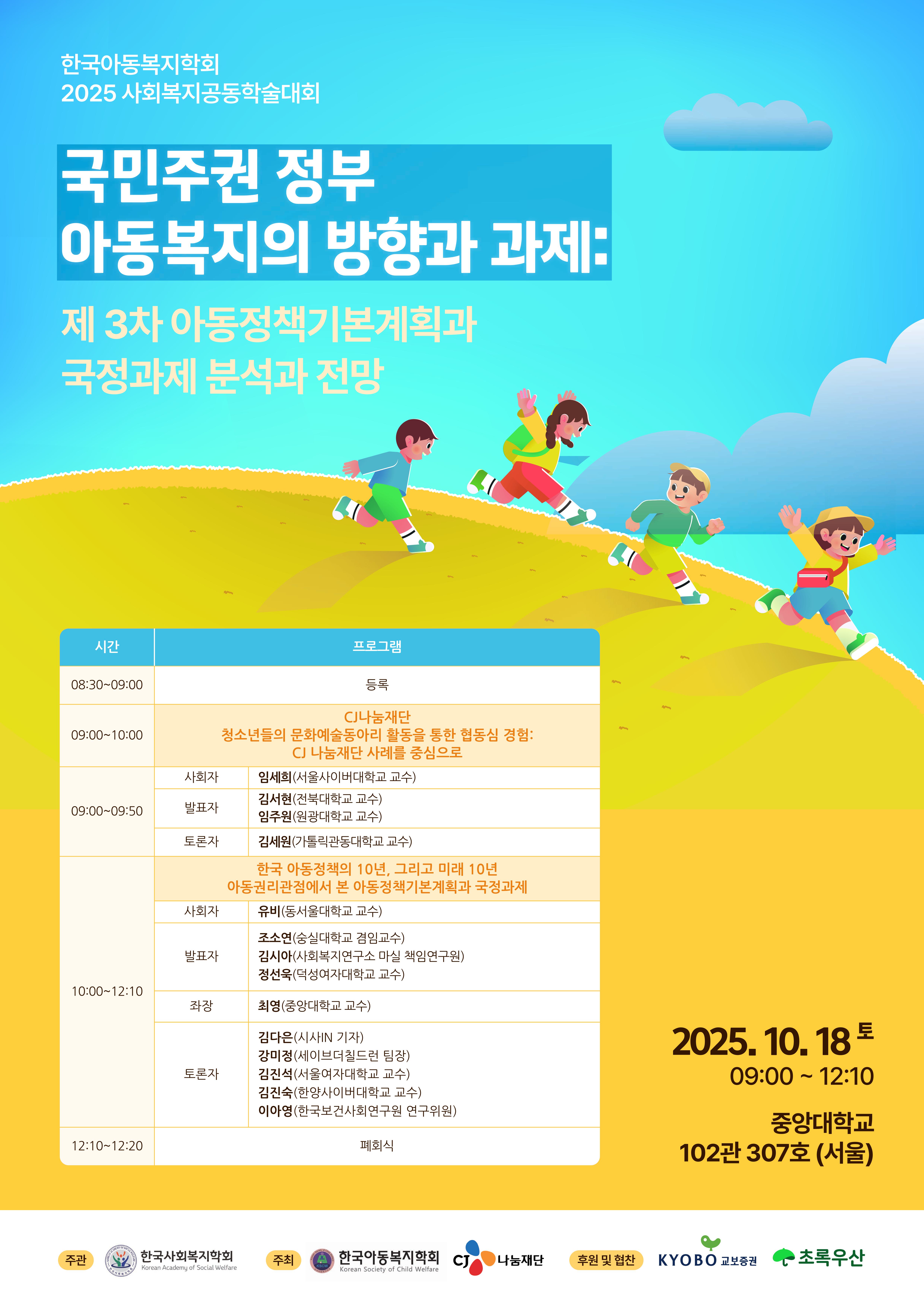 이번 학술대회는 10월 17일(금), 18일(토) 이틀간 서울에 위치한 중앙대학교 102관에서 개최되며, 한국아동복지학회는 18(토)에 진행됩니다.